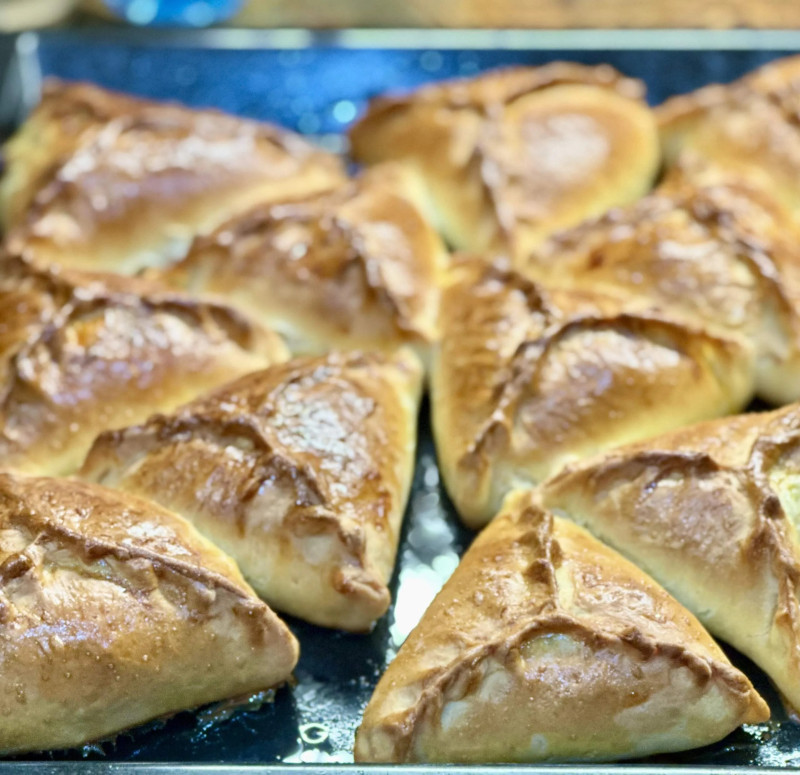 Из теста сформировать шарики весом по 50 г. Раскатать в тонкий круглый пласт, по центру выложить 1–1,5 ст. л. начинки. Защипать так, чтобы получился треугольник, в центре оставить дырочку.