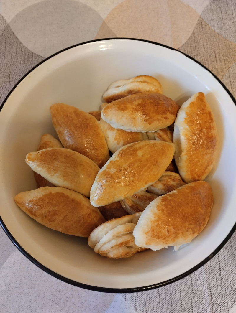 Пирожки с луком и яйцом. Начинку сделала, на сколько лука, привезенного с огорода, хватило.