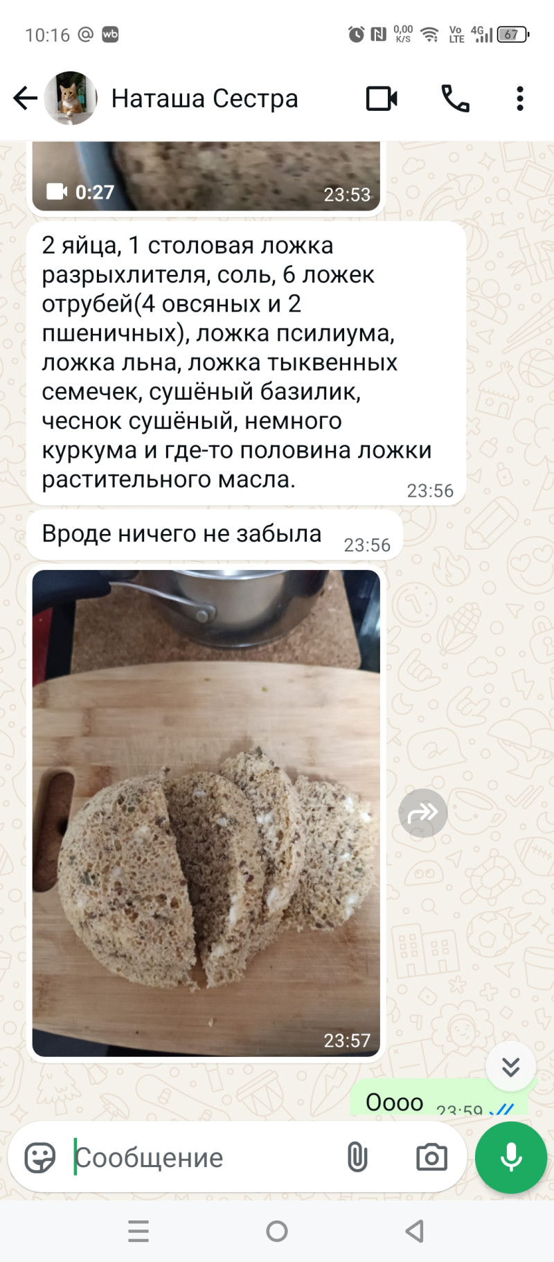 Ходили в лес с сестрой, она угостила меня хлебом, который делает за 6 минут в микроволновке, очень вкусный И полезный ) без муки