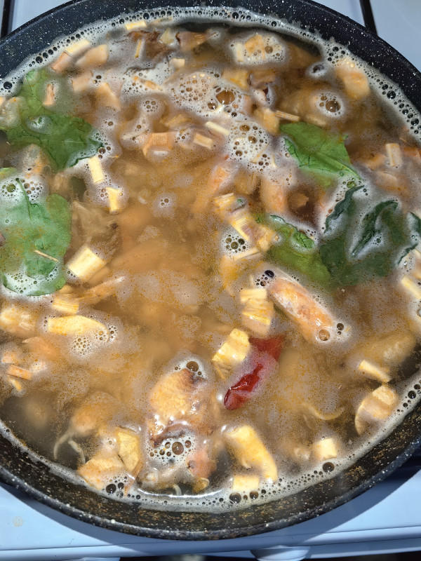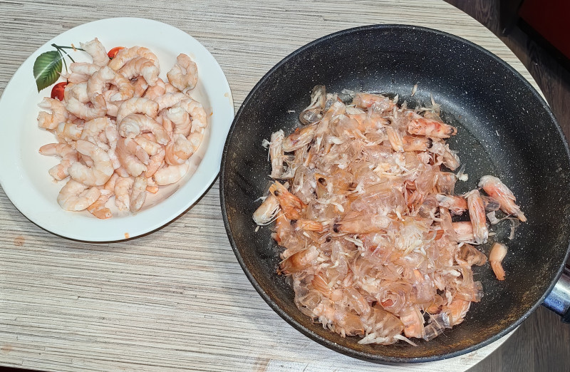 Сначала чистим креветки. Все головы, панцири и прочее обжариваем на глубокой сковороде с небольшим количеством растительного масла с добавлением перца чили (один маленький перчик - это уже очень остро, имейте в виду), корня галангала и лемонграссом. Затем прямо в сковороду наливаем полтора литра воды (можно немного больше), добавляем несколько листиков каффир-лайма, все это доводим до кипения и варим на медленном огне 30 минут.