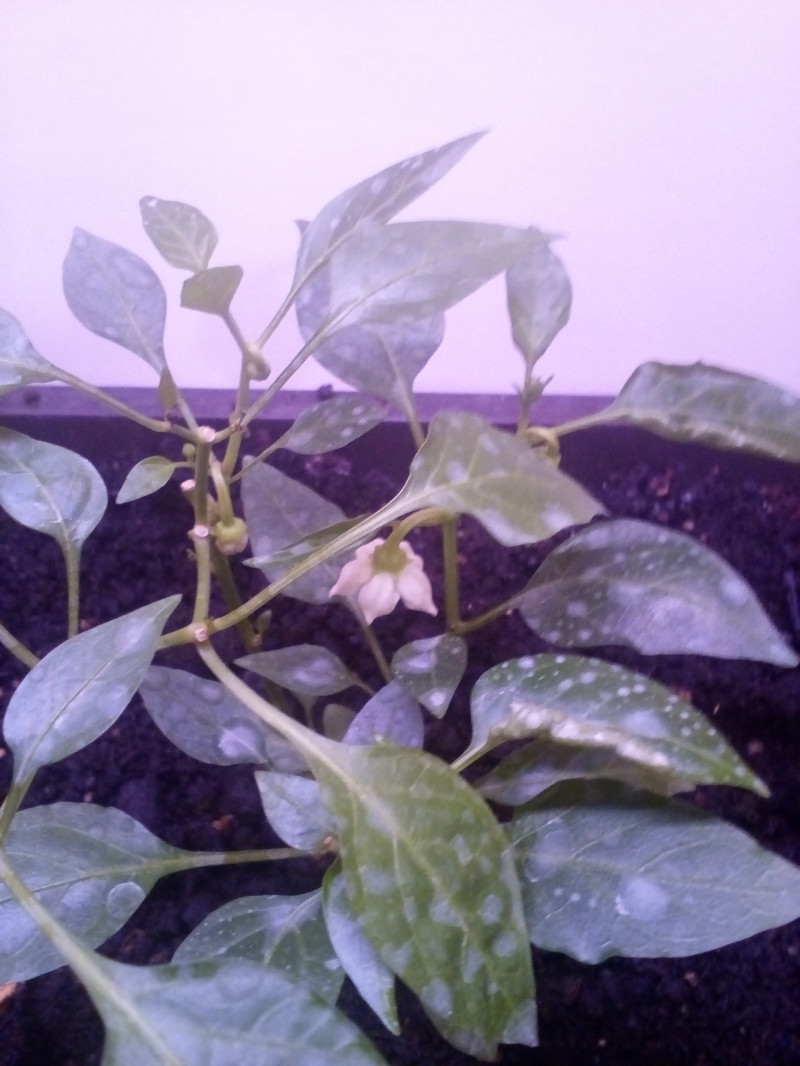Пятна на листьях..это "Завязь" опрыскивал. И не знаю почему,у перца после пересадки два листа как то за вернулись..