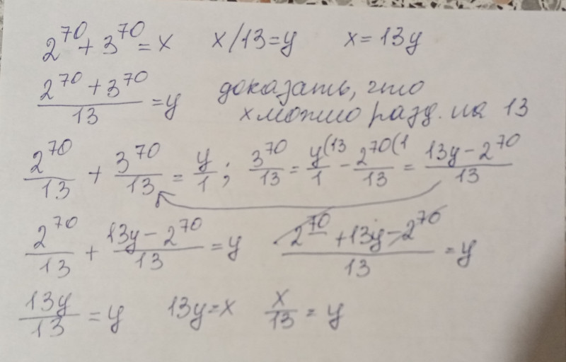 Утро доброе! Елена,а где про 2 в 70 и 3 в 70? В вашем доказательстве вместо них можно поставить любые числа. Нужно доказать,что при делении на 13 будет целое число,а не просто,что можно разделить.