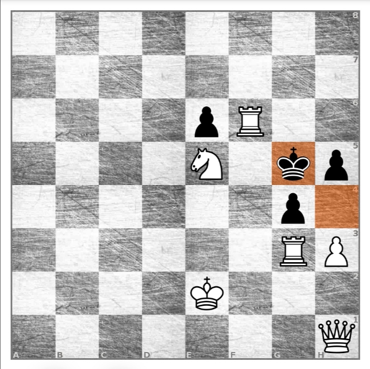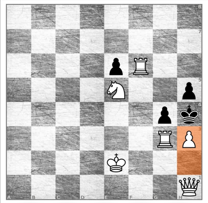 1. белая пешка с H2 на H3 черная пешка с G4 ест белую пешку на H3 2. белый ферзь ест черную пешку на H3 если черный король идет на G5, то между белой ладьей и черным королем черной пешки нет, она съедена белым ферзем
