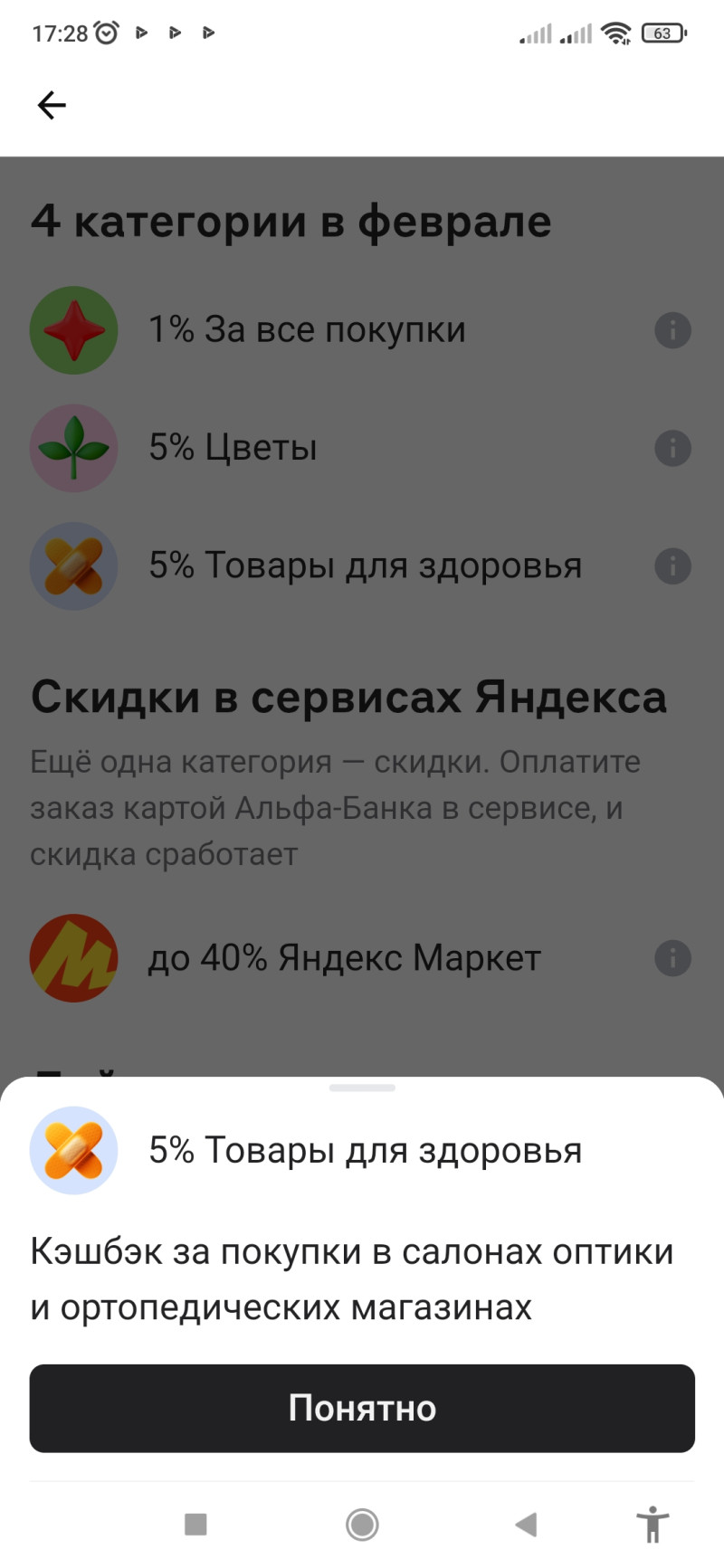 Плюс в городе всё-таки больше вероятность попасть в нужную категорию кешбека, чем в моей деревне. Вот я выбрала на февраль, у меня будет только 1 % кешбека. Очки я не покупаю, цветы тоже, Яндексом не пользуюсь.