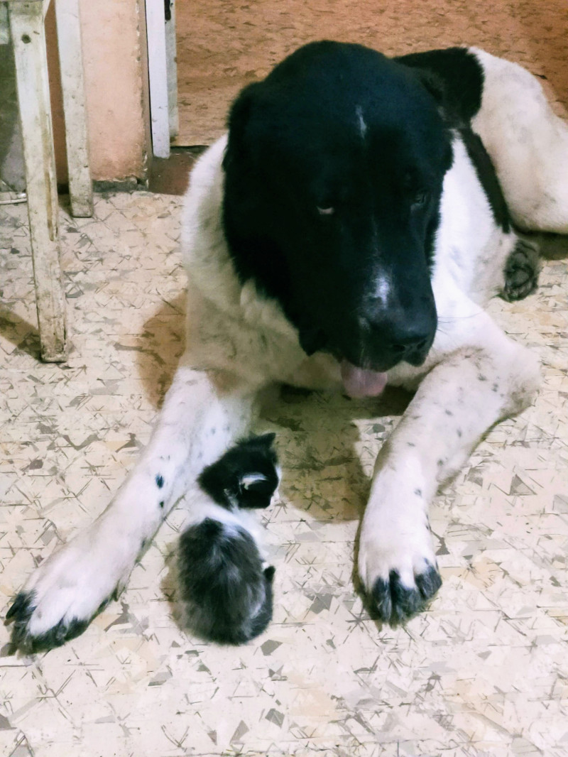 Это был большой пап, для котят, контролировал процесс кормления, подмывал по необходимости. Котята выросли , а пес опять ищет о ком заботится)))