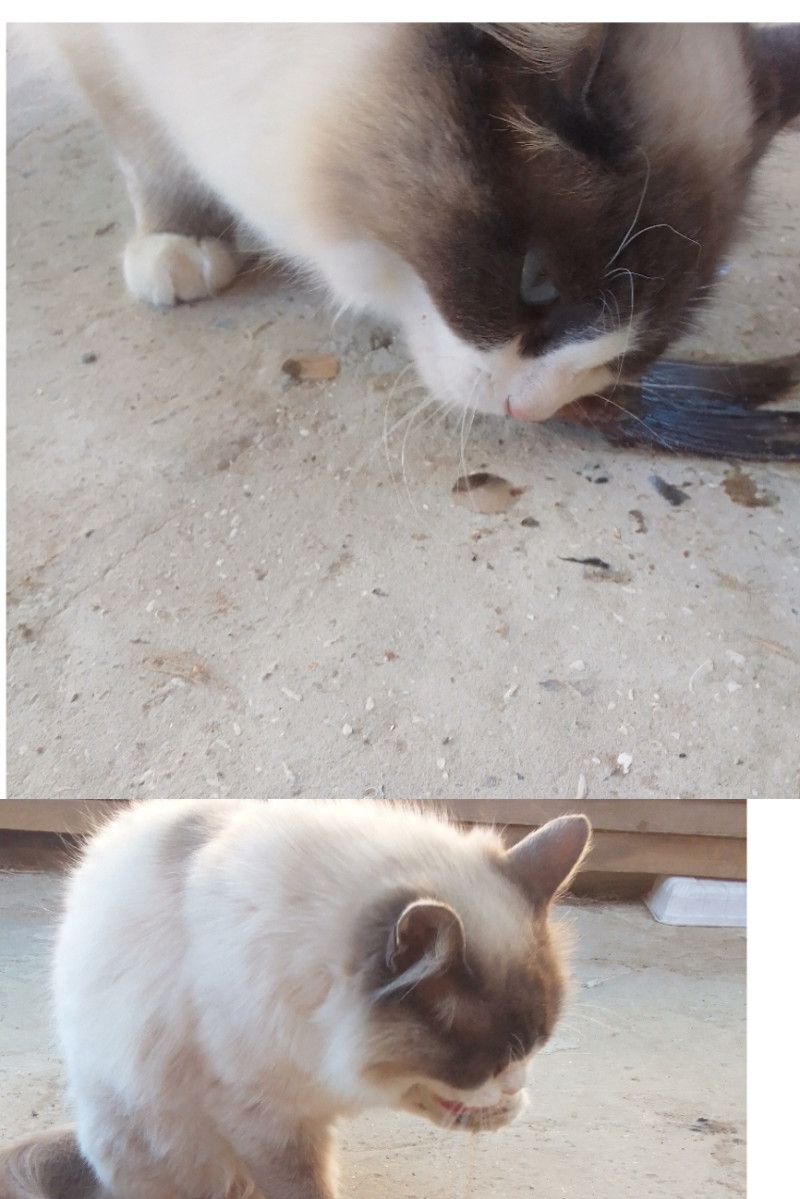 А вот со специальным кормом беда, ну не хочет он его есть. Три дня с плясками, бубнами, уговорами, кормлением по штучке с руки удавалось скармливать и то не всю суточную дозу, а сегодня вообще демонстративно " зарыл" миску с кормом, руганулся на меня и ушёл. Когда завтракала, этот артист сел напротив и глазами, полными слез и укора, зло смотрел на мой с