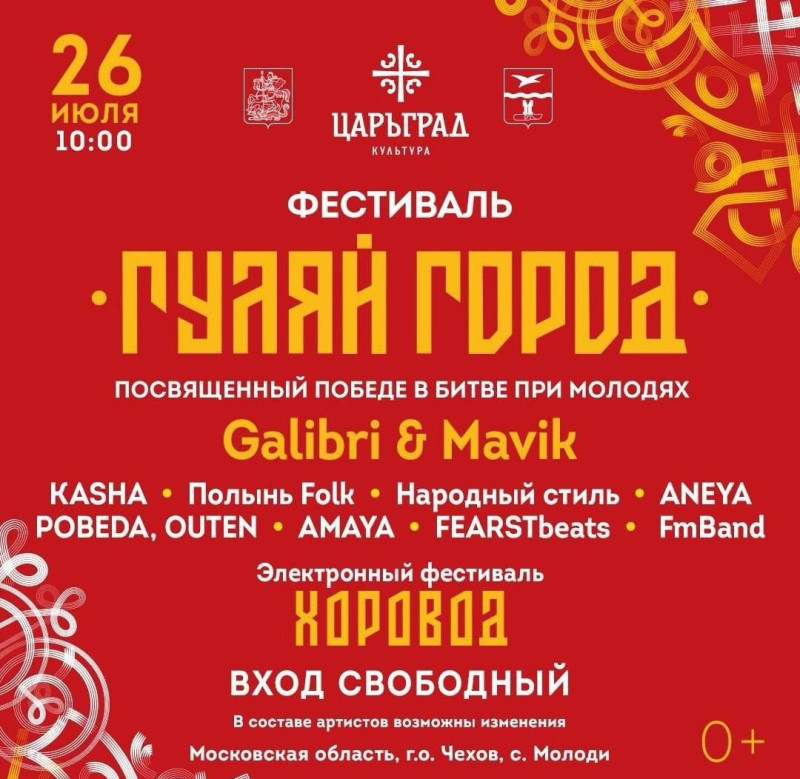 - выступления творческих коллективов и музыкальных групп: «Оберег», «Венница», «KASHA», «FM Band», «POBEDA & OUTEN», «AMAYA», а также хэдлайнеры — GALIBRI & MAVIK.