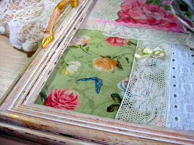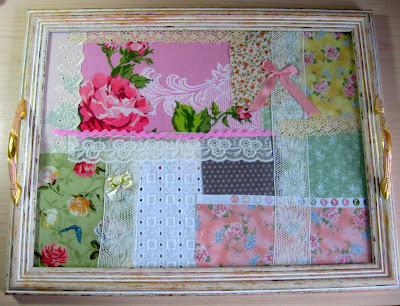 Очень кстати подходящая фоторамка с эффектом потертостей и самого хорошего размера 40х50 нашлась в ближайшем фото магазине, мебельные ручки пришлось поискать, не совсем такие хотелось, но выбора нет совершенно. Нашла в мужнином хозяйстве отвертки и саморезы, привернула, сломала стекло, сбегала в тот же магазин, купила еще одну раму( она мне потом пригодится, уже и идея есть), заменила стекло, сложила коллаж из тканечек и кружавчиков, закрыла стеклом, немного прошлась краской по раме и ручкам и вот такой романтический подносик получился! ( вы заметили. что все мои поделочки- рукоделочки в последнее время какие-то романтические получаются? Я думаю, не к добру))))