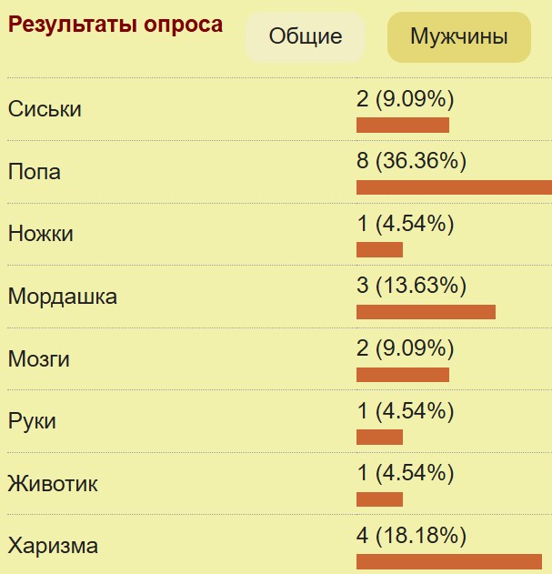 По результатам опроса (скрин ниже). https://gdepapa.ru/forum/live/sport/topic54098/Да, тема шуточная, но в каждой шутке, есть доля шутки… (никто серьёзно такую правду Вам не озвучит )Брятанские учёные считают, что виноват силикон, типа музжиков искусственное раздражает. Так это или не так, мне всё равно, но прикольно. Попа вне конкуренции!Харизма на втором месте.Мордашка на третьем!!! Работящая мало кому нужна, мозги на уровне сисек… Это жизнь, есть жизнь… В общем дамы! Качайте попу!!!