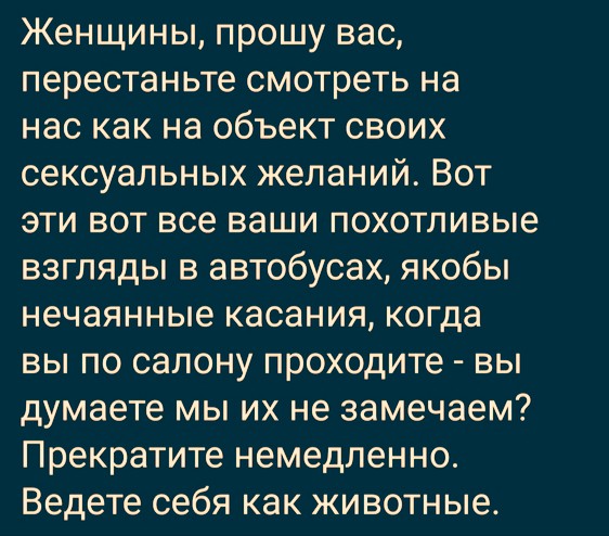 Да, вот меня давно мучает вопрос к мужчинам (вернее, у меня есть вариант ответа, но вдруг ошибаюсь): при наличии в анкете на сайте десятка различных фото зачем просить прислать фото в вотсап в первый-второй день знакомства? Если вы уже перешли в вотсап и понятно, что перед вами не фейк.