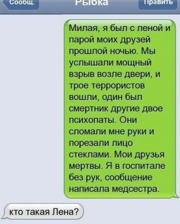 У нас в браке с бывшим часто так было.... " - А куда это ты собралась? - Как обычно, к любовнику)))...А пока меня не будет, можешь приглась свою Надю, только пусть разуется, я пол помыла..."