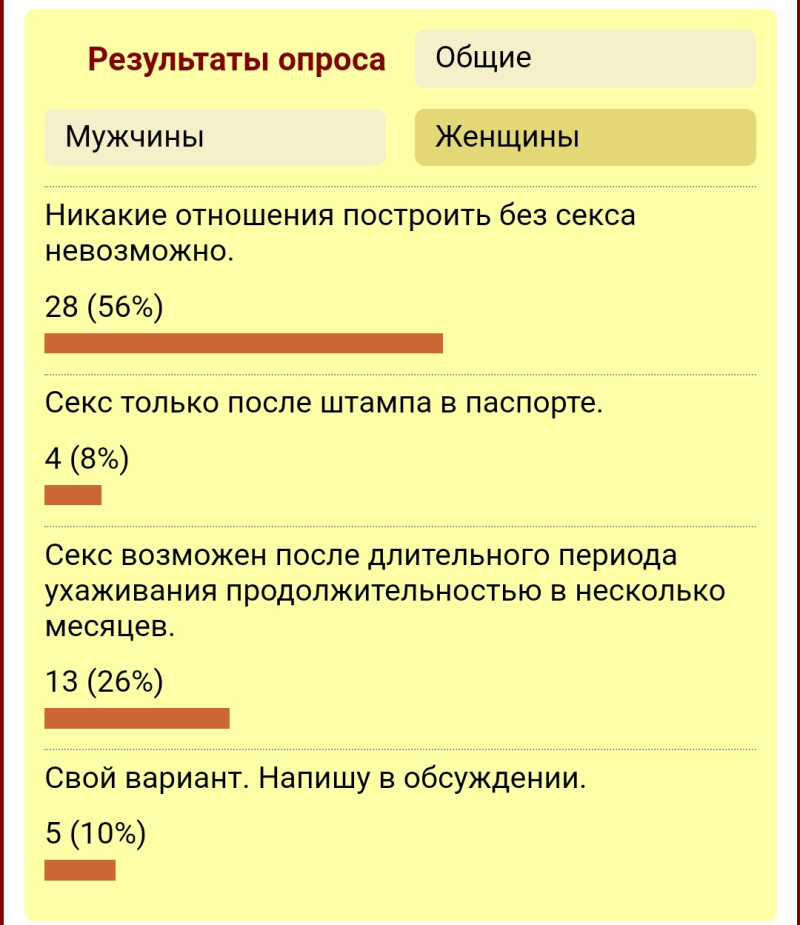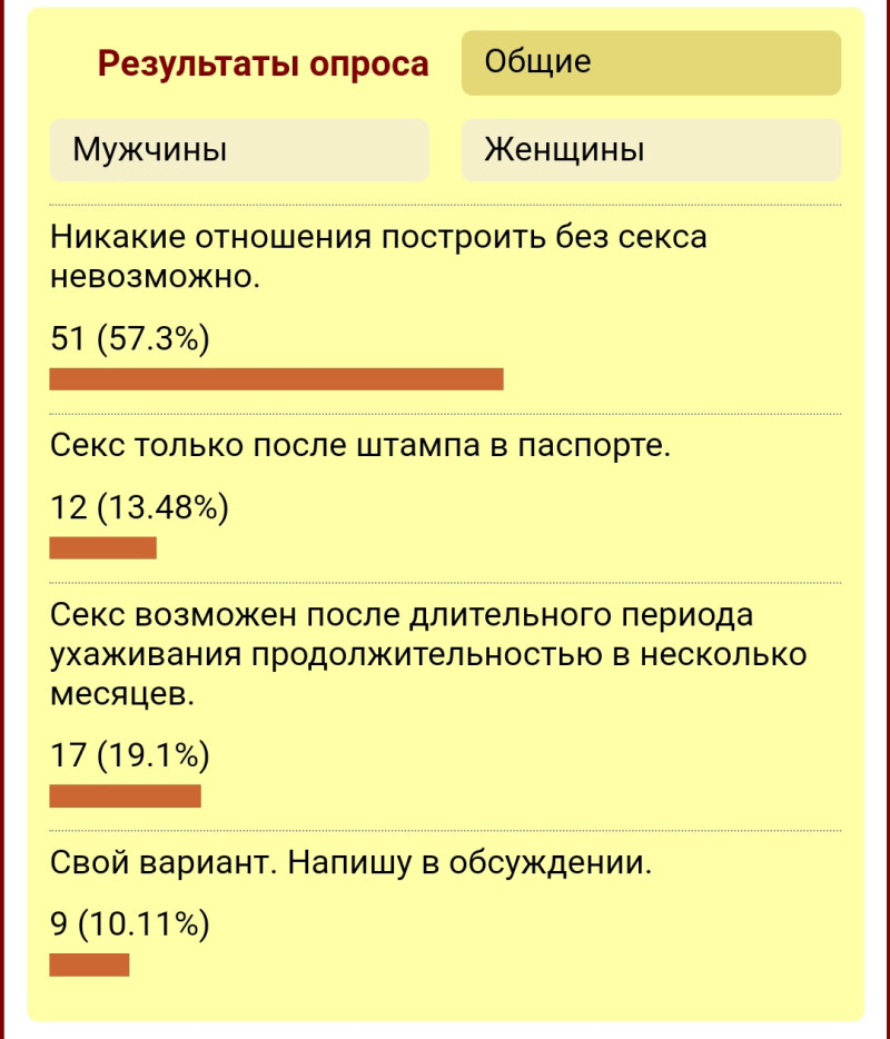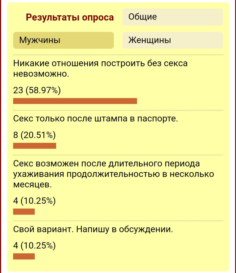 Юль, так мы б отметились в опросе и в соседней теме, любой, с адекватным ТС договорились бы и раскрыли бы тему секса.
