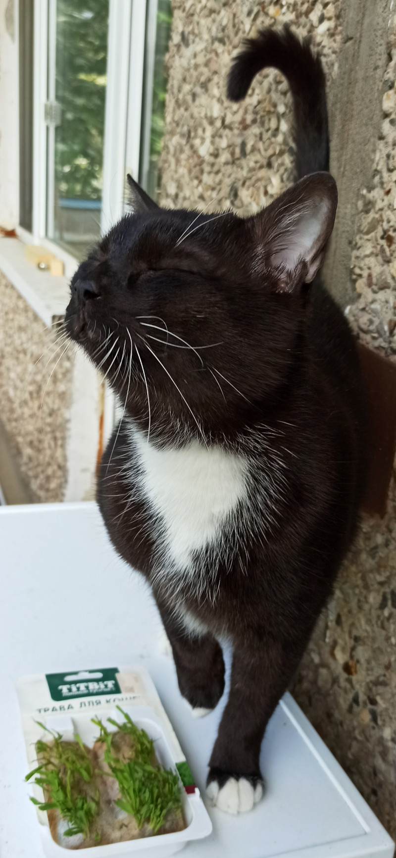 Котик на балконе балдеет. Ему в шубе не холодно и солнышко.