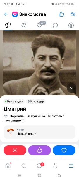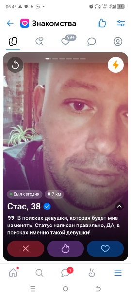 А я не подстраивающаяся. Знаю чего хочу. А если у Васи заявлено "серьезные отношения", он серьезно хочет встречаться с одной женщиной на выходных на пример. Но семейную жизнь не планирует. Для него это тоже серьезные отношения. Не факт что это выяснится с ходу. Или Вася понимает, что большинство женщин ищут именно это. И он намеренно указывает это. Чтоб расширить палитру. И вешает ей лапшу. Пока она сообразит... Очевидно вроде. Не?