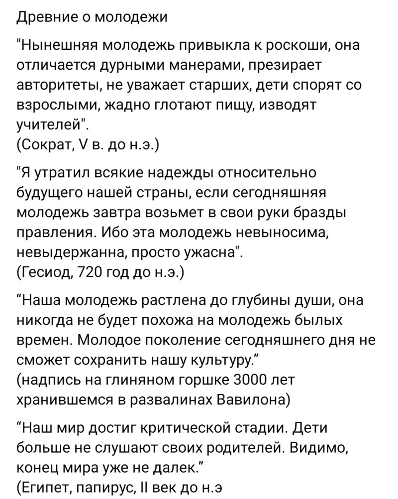 Во все времена это было, есть и будет. Сидят тут как склочные недовольные всем старушки и раздают штампы направо и налево молодеж им , ля, не та! Кто её эту молодёжь воспитывал то?? Дядя Саша Пушкин?