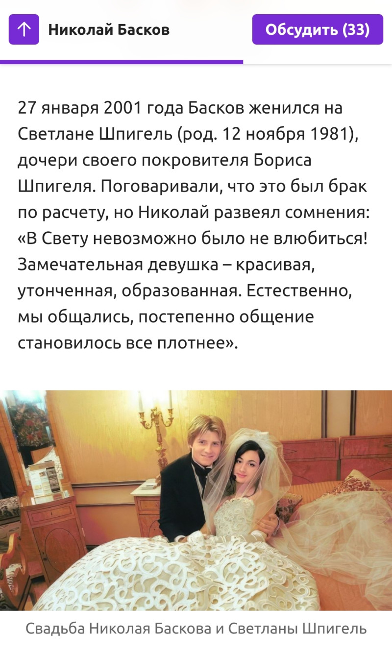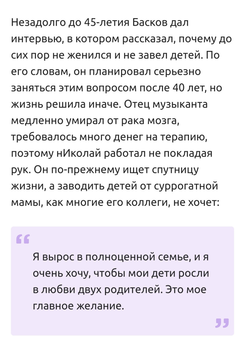 Про Баскова пошла посмотрела)) Он был женат и есть сын, но при разводе жена забрала сына и они не общаются. Интернет пишет что у него всегда какие-то девушки были потом, модели, даже Волочкова, но не женился