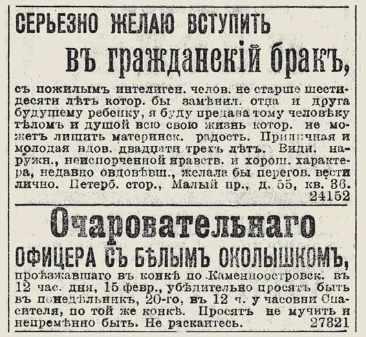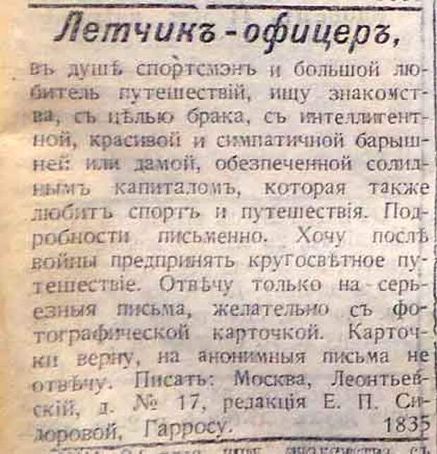 Если почитать старинные брачные объявления, то понимаешь, что все одно и тоже: деньги, возраст, место жительства. Интересно да? Ну детей не хочет чужих это понятно, обеспеченную надо, тоже понятно, но девицу до 30, а вдову до 35. Тоже же с деньгами ищет. И чувства и как бы и в Москву жить. Во, по-любому кастинг Вот и студент фишку рубит Парень загрустил походу. Тут чето я недопонял "Деньги у меня будут потом, как только ты работать начнёшь?"