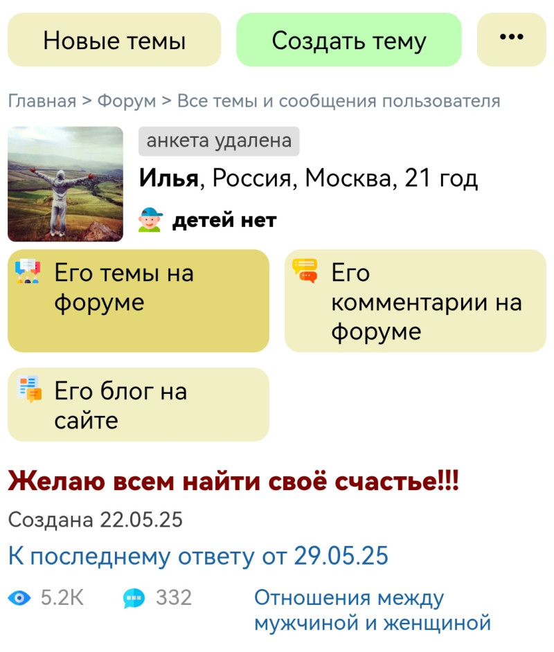 Добрый вечер уважаемые форумчане! Вот и настал тот день, когда пришло время удалить свою анкету! Нет, я никого здесь не нашёл.. Просто надоело) Я здесь за многими наблюдал довольно продолжительное время. Если кого-то обидел, извините, не со зла! Очень хочу пожелать счастья.. Татьяне из Москвы. Татьяне из Краснодара. Ольге из Тулы. Оксане из Питера. Вы те девушки, которых было очень интересно читать! От Вас никогда не слышал негатива в адрес других! Ольга из Перми! Вам терпения! Все
