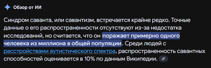 Процент одаренных там едва ли больше среднего по популяции, зато воспринимается как "вау" надо же аутист - а как рисует/считает/помнит/анализирует!".