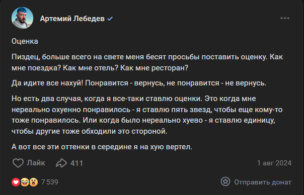 Этот Артемий Лебедев ещё и провокатор. Он обычно что то напишет и под постами его много обсуждений и рассуждений, кого как триггерит. Я кажись подписана на него в ВК. Мне иногда нравится почитать разных людей, разные мнения и всякий срач)))) люблю наблюдать за людьми )). Это прям в его стиле , вот мы теперь ж обсуждаем это все)))