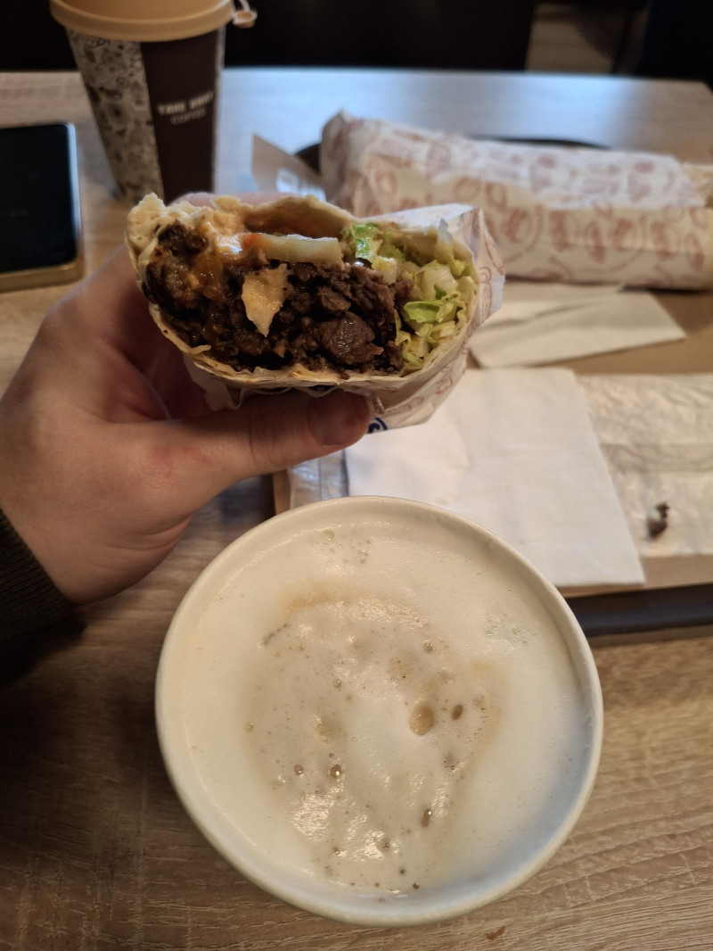 Устроили сегодня рандеву с телочкой. 2 шавы одна с говнядиной, другая с креветками + 2 латте - 2400р. Дороговато нынче тёлыч на свидание водить...