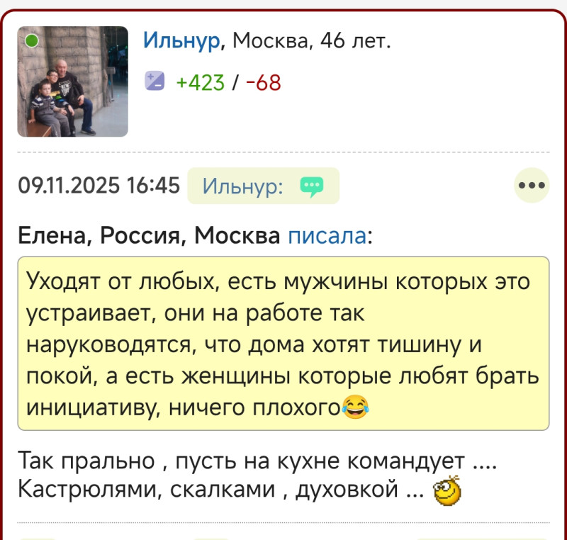 Лен, мой коммент был Ильнуру, про сковородки и кастрюли, а так разные люди, не все мужчины хотят командовать, как и не все женщины.