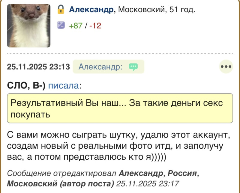Вы сразу мне напророчили мужчину, чтоб обязательно гадкое что-то привнес, ведь я в чем-то там на форуме уже 5страниц не согласна и не разбираюсь
