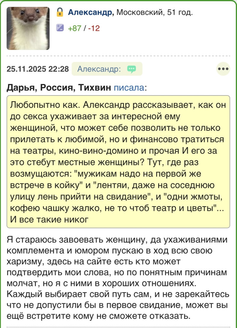 Ой бесполезно поняла диалог вести ведь опять видите только что хочется. Пыталась разжевать в чем нюансы но не получилось только эффект передергивание смысла. Если видите то что хочется то и получите такого мужчину который будет хвастаться как занимался сексом и ему отказала потому что умеет ухаживать, а не просто здесь делиться попытками построить отношения.