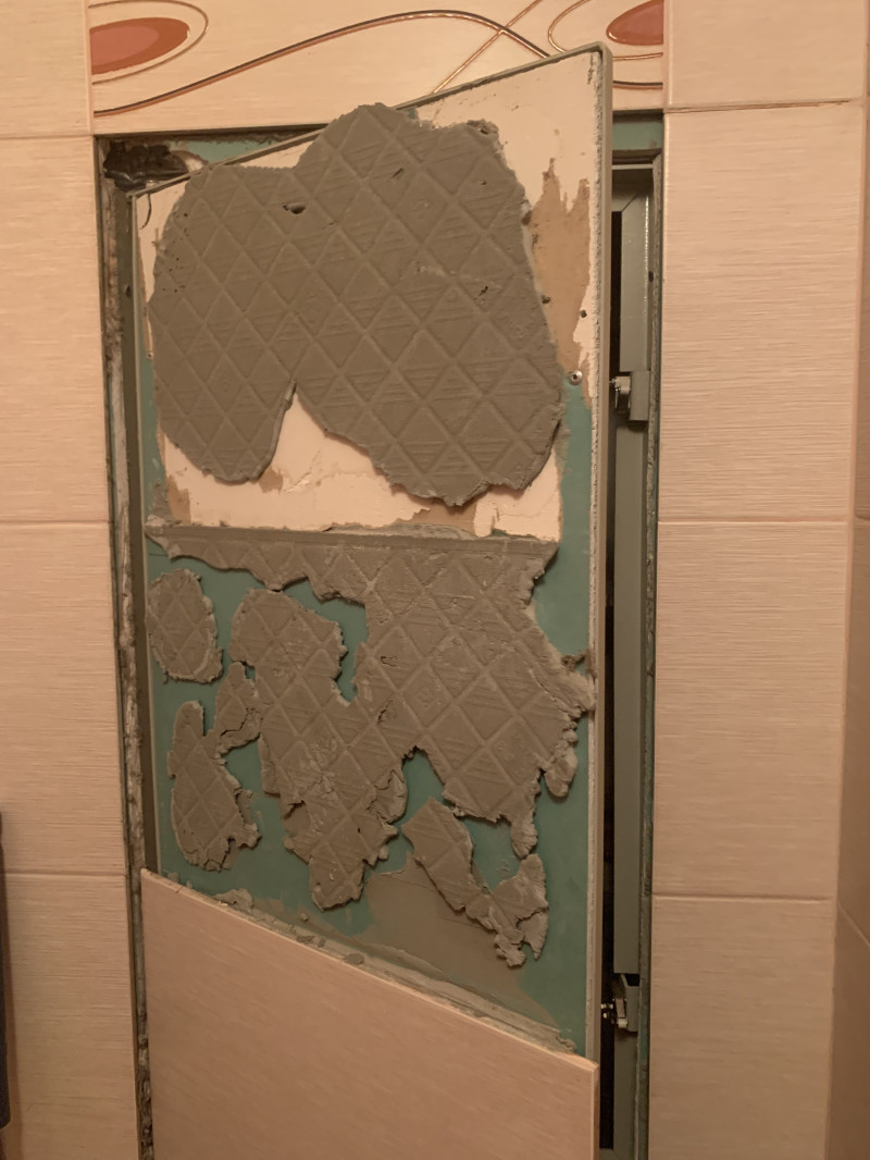 Это дверца где трубы и счетчики, крч я хотела ее открыть и забыла как… ну и в руках оказалась отвертка и плитка отвалилась(((