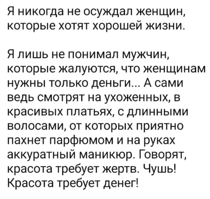 ВЫ одна, рядом с Вами никого нет и никто не предлагает Вам денег, что бы сохранить или преумножить вашу красоту!!!