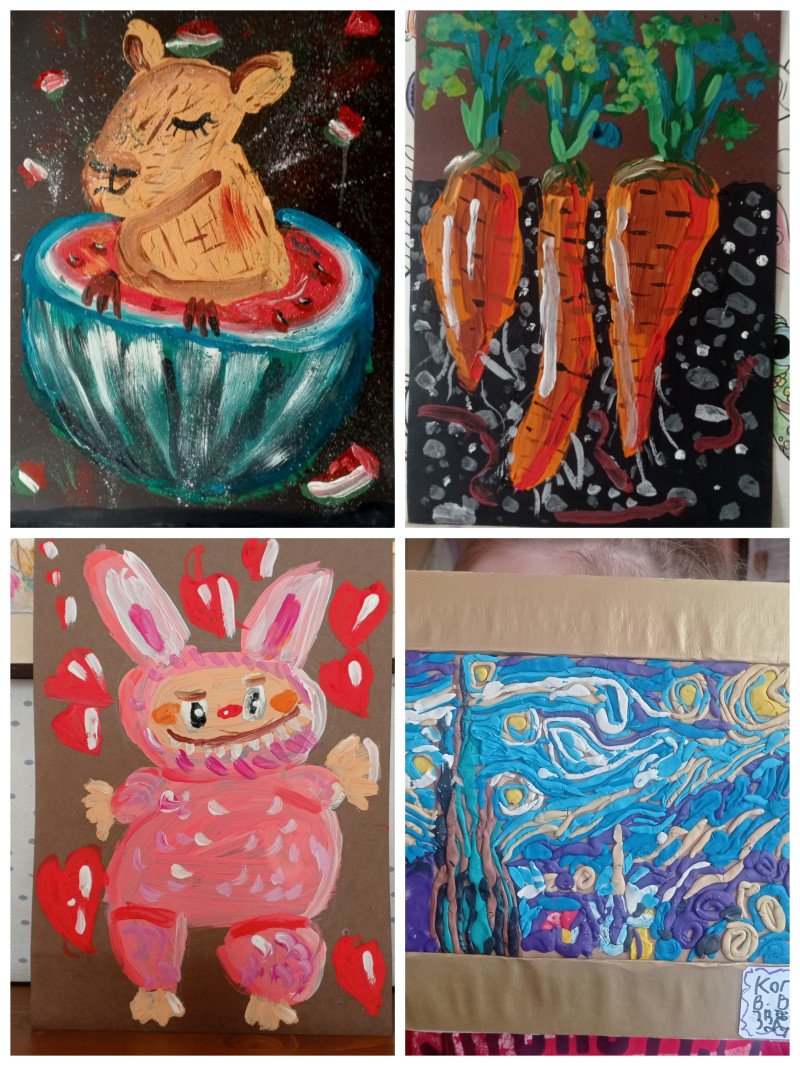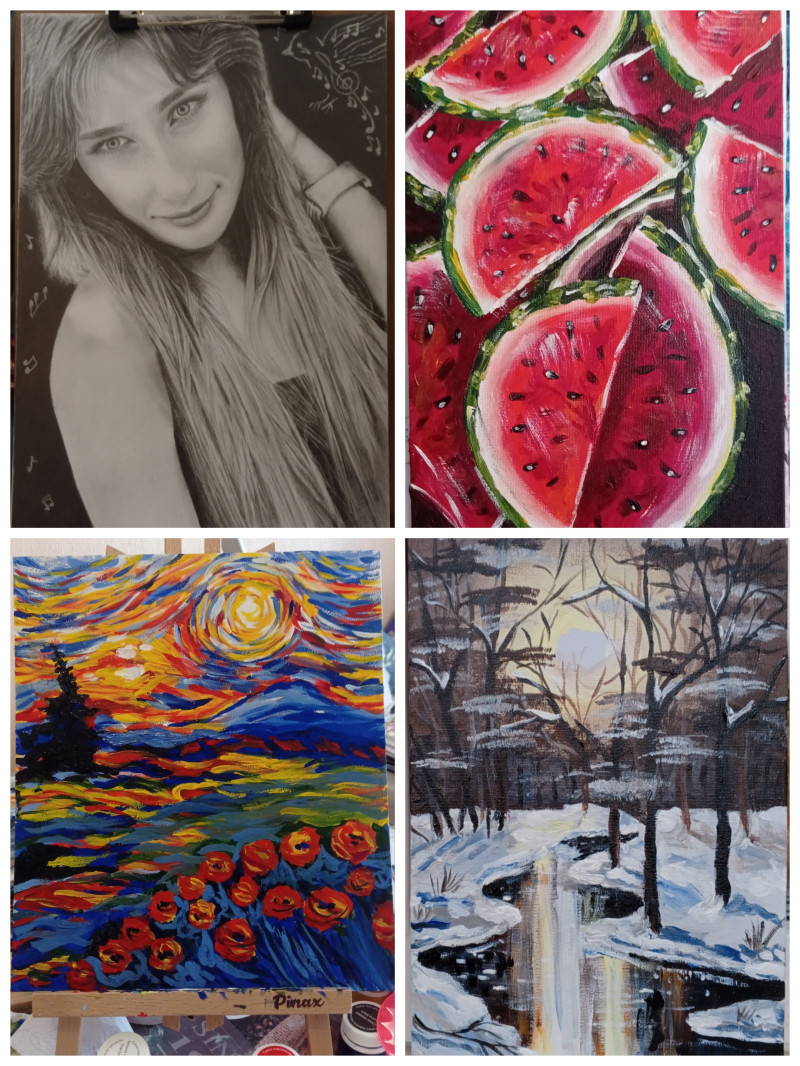 Порылась в закромах проба акрила,не очень нравится ,быстро сохнет,масло больше люблю.Картина с маками ,гуашь профессиональная,в стиле Ван Гога,очень захватывающе было писать .И портрет дочери подруги,ч/б простой карандаш. А,это моя гордость обучаю воспитанницу живописи,девочке 6 лет скоро исполнится.И картина пластилином по Ван Гогу