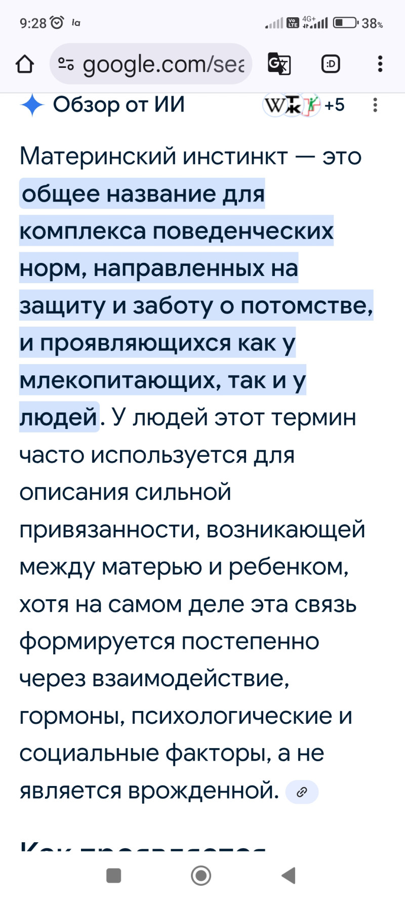Если погуглить, ИИ даёт собирательный и обобщенный ответ: материнского инстинкта у человека нету. Какие Ваши доказательства о его наличии?