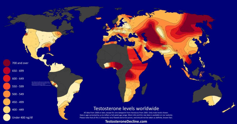 В Евразии существуют два четких «тестостероновых центра» — Восточная Сибирь/Центральная Азия и Западный Прикаспий. Высокий уровень тестостерона напрямую связывают с суровой жизнью в резко-континентальном климате степей и высокогорьях. Утверждения о «природной мужественности» русских по сравнению с «изнеженными» европейцами неверны — уровень тестостерона у великороссов сре