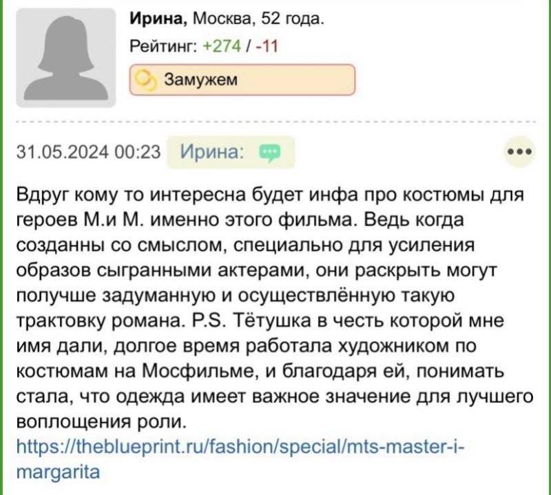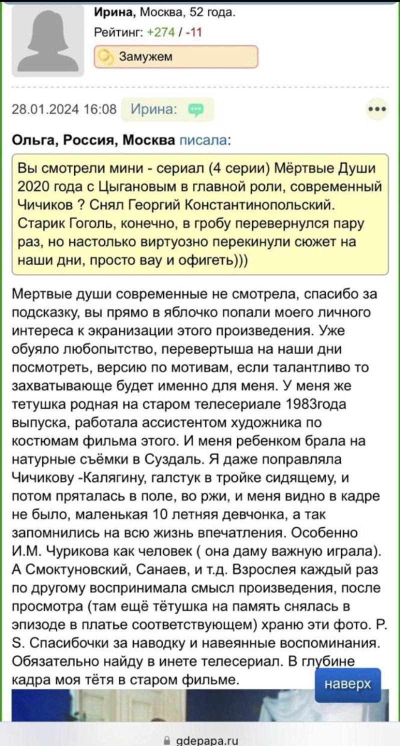 Ой уже доказала что она племянница моя Ирина от старшей сестры. Пропустили в теме «общага» где выкладывалось что встречалась с форумскими для своей интенсификации личности даже документы показывала, и с кем подружилась и видимся теперь в реале. Вот выложу когда на форуме Ирина упоминала моё имя и кто такая по профессии. Так как роднуля воспитывалась и мной и моим мужем сценаристом, она мне подражала с детства в манере говорить и писать. И это я полукровка а она не скрывала что только по деду разбавлена её славянская кровь. Вот из архива тем форумских упоминание про меня.