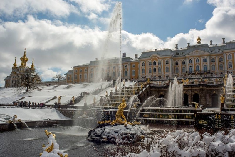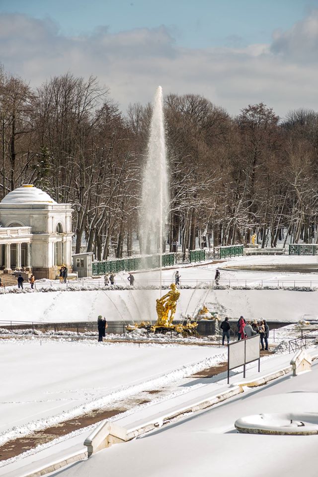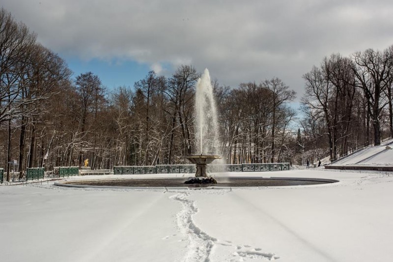 Петергоф. Апрель 2017 г. Уникальное зрелище - снег и работающие фонтаны.