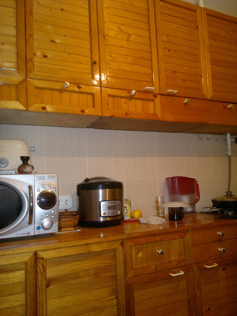 У него чего только не было... Вот одна из моих любимых работ. Инструмента тогда у меня особо и не было, поэтому я ее ценю, кухню эту. Сестре отдал, теперь она пользуется. Дерево натуральное.