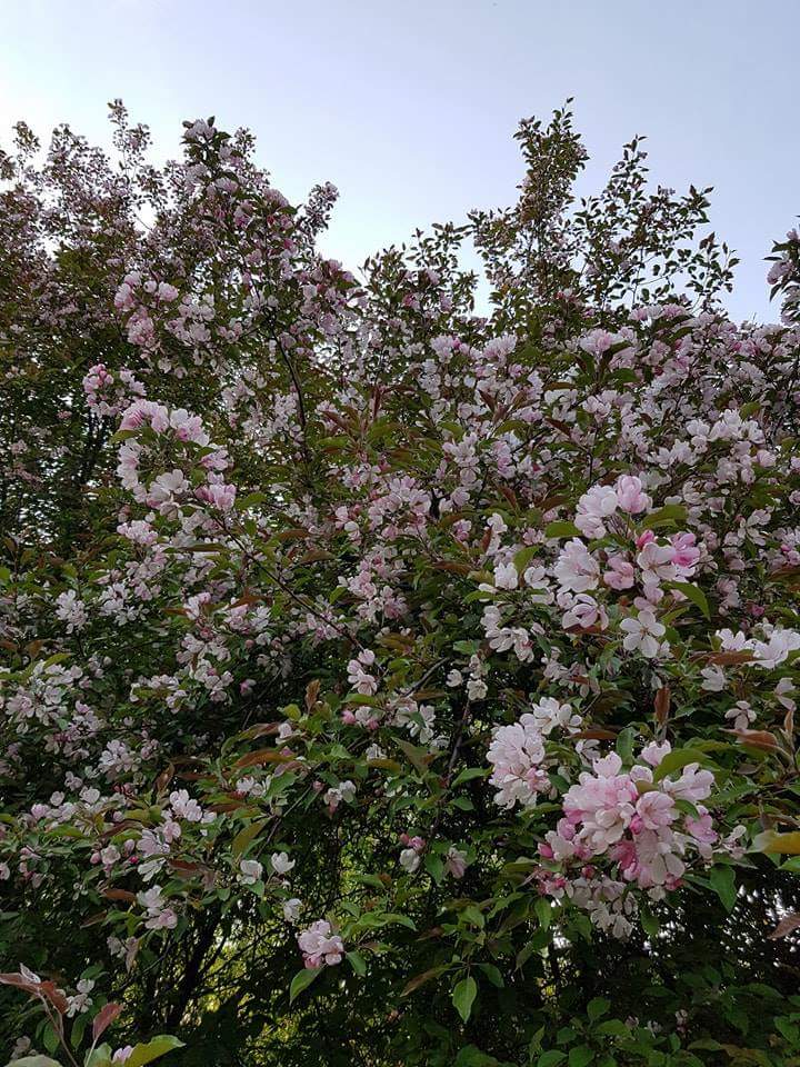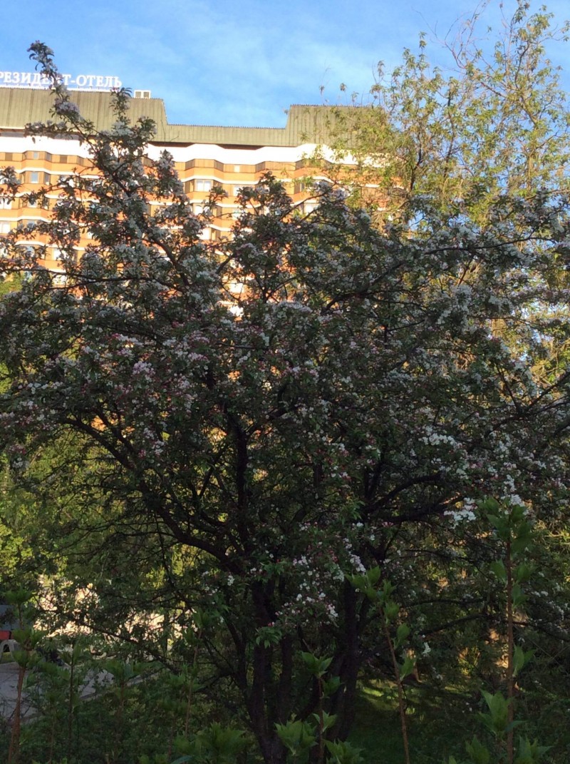 Это яблоня. Огромная. Ее издалека видно. Вся розовая и пахнет совершенно невероятно.