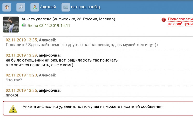 Мне вчера Анфиса 26 лет написала: пошалим?... спрашивает. Я пока думал ее анкету удалили... А ведь может это моя судьба была...