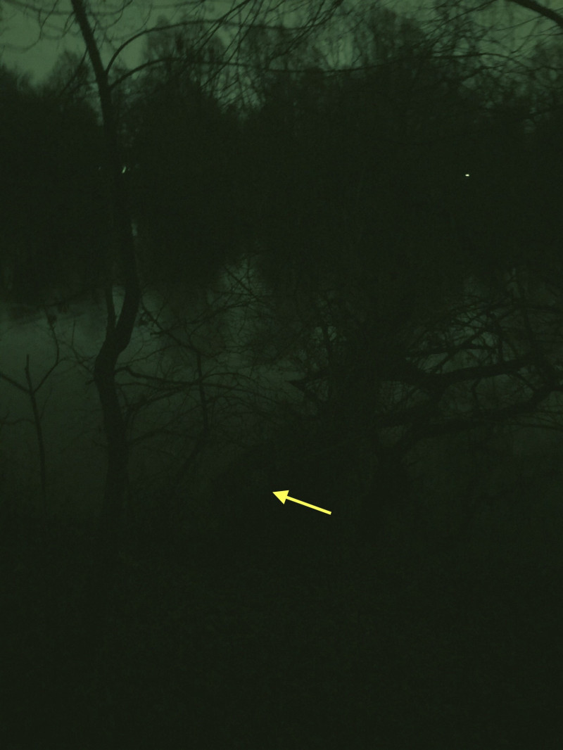 Подумала, вдруг будет второй шанс, и повернула обратно. Лисе внимания не хотелось: пряталась за лавку, потом спустила к воде. Я сделала кадр и ушла. Фото в обработке, не хотела пугать фонарём, хотя с собой был. силуэт плохо видно, лиса забралась на ствол дерева, что висит над водой. А может лис?