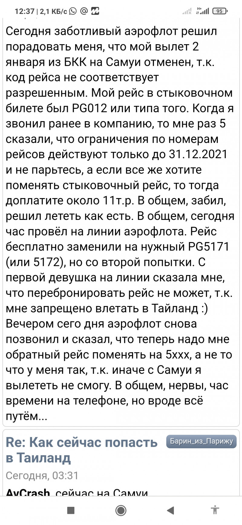 Так о чем и речь, вы не хотите, а не Таиланд закрыт ) я для себя вообще не вижу каких-либо проблем и барадака, что касается рейса Аэрофлота, еще два месяца назад всем разъяснили, что прилет в песочницу должен быть не внутренним рейсом. Потом начали давать допуски по отдельным рейчас разных АК.