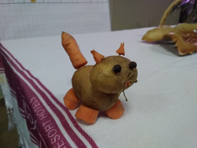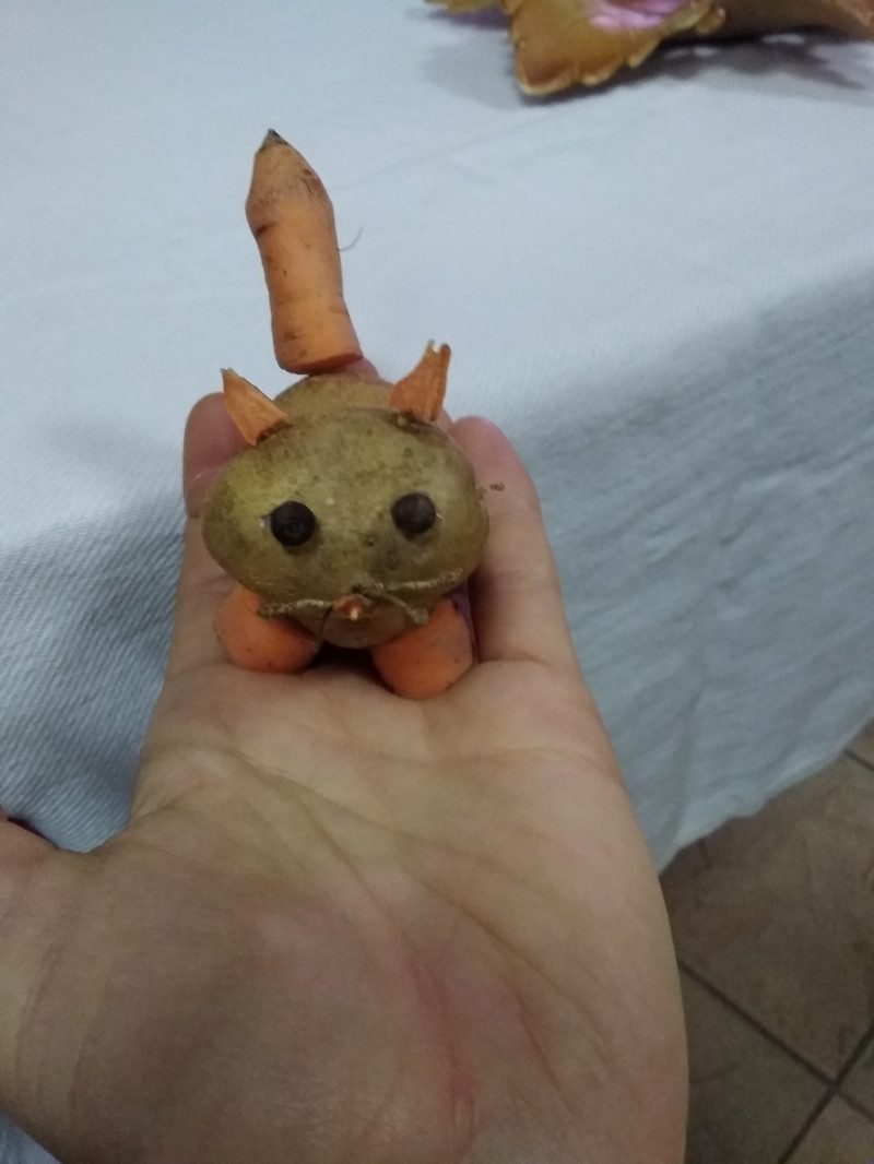Кот из картошки + морковки + перчинок .