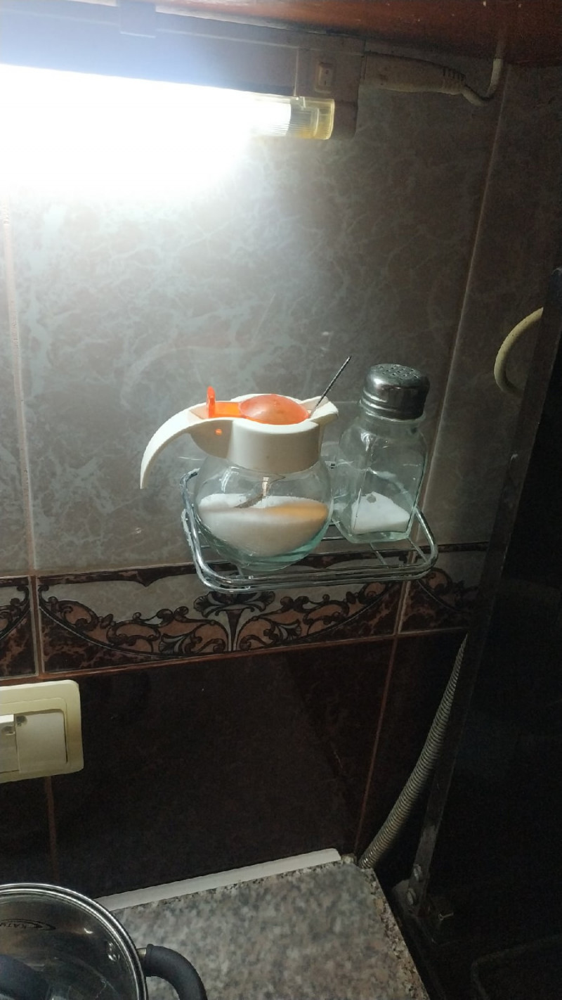 соль перенёс на стену , сахар со стола перенёс внутри шкафа с прозрачной банкой