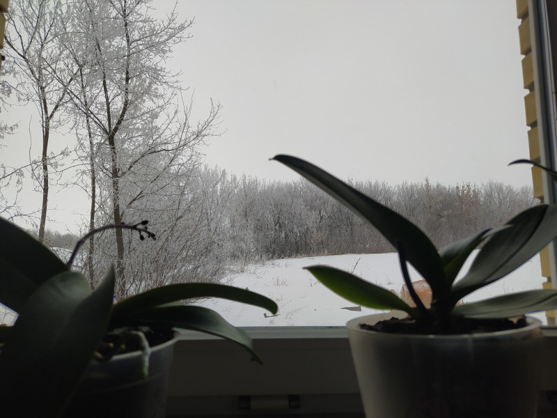 У нас чуть потеплело, деревья все в инее)) А в конце февраля прогнозируют обильные снегопады. Моя орхидея взлумалась цвести. Не особо я их люблю, эти орхидеи, но в новом доме с ними легко - большой подоконник в ванной для них. Раз в неделю спустила их в ванну, душем помыла и полила заодно, через 5 мин вернула обратно.
