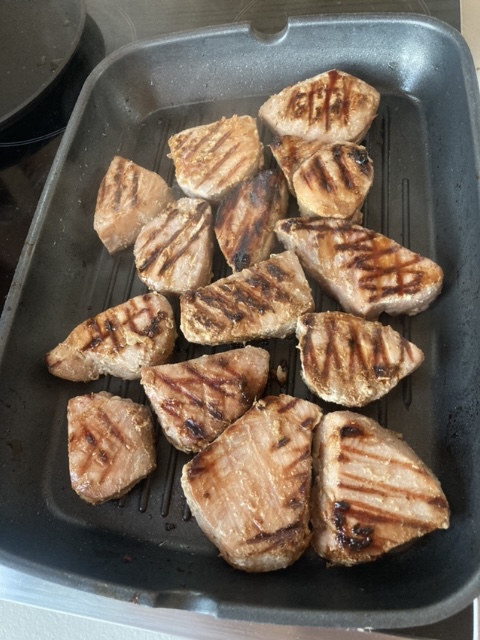 С первой попытки блин! Тунец.)) Он мягонький… обжариваю шустро и фольгой накрываю, чтобы доходил. Сырой/полусырой брро… не любим