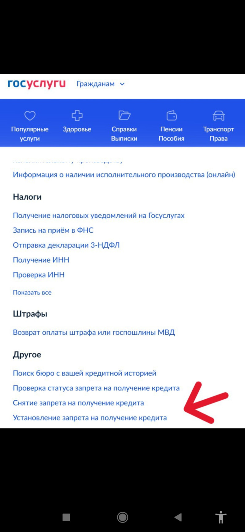 С сегодняшнего дня на "Госуслугах" в разделе "Штрафы и налоги" можно установить запрет на получение кредитов.