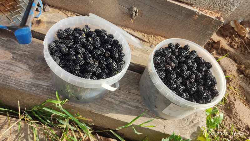 В прошлом году оставалось чуть малины и чуть ежевики, смешала, добавила сахар и блендером. Потом по маленьким контейнерам и в морозилку. Очень интересный вкус получился. Первый год и варенье из нее варила.