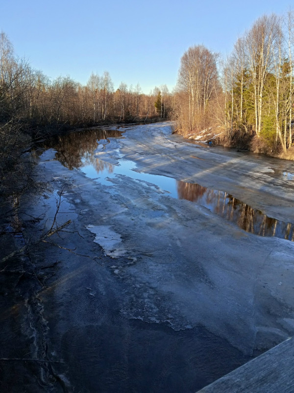Бежала на остановку через мостик,речку сфоткала,во льду ещё стоит.