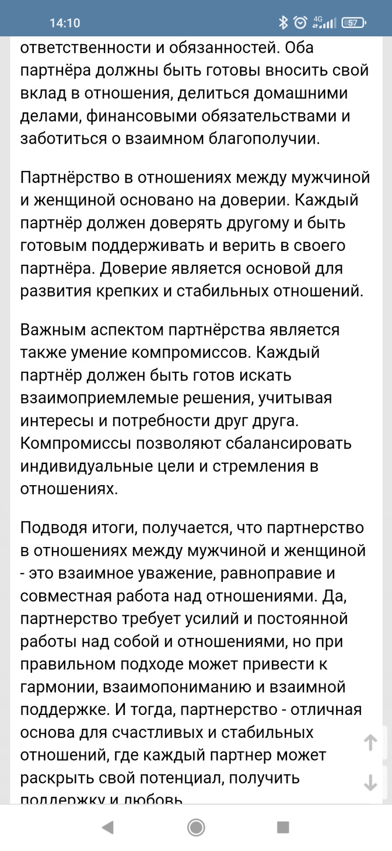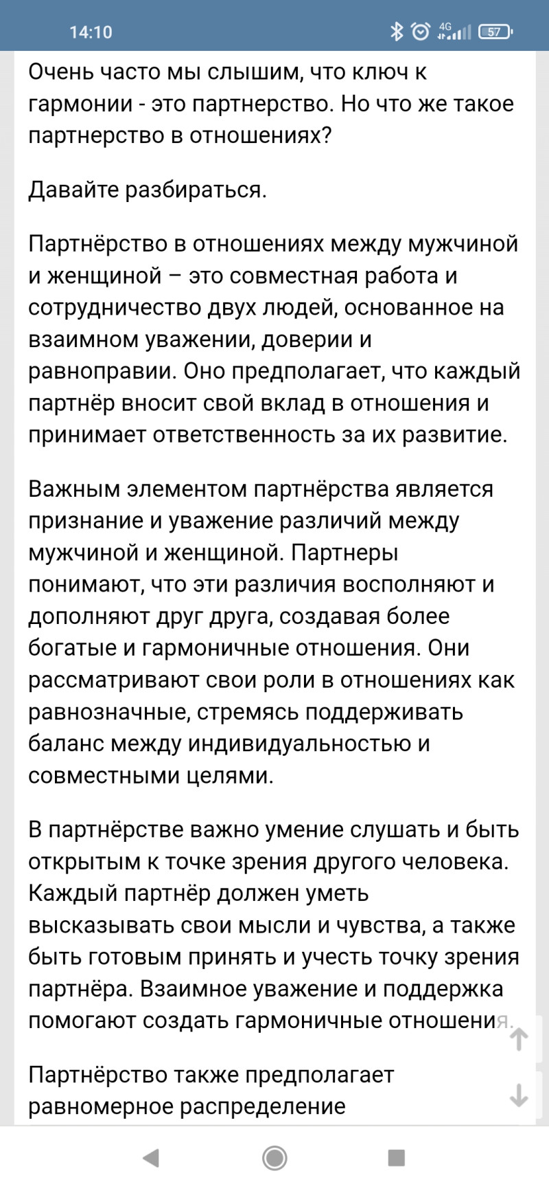 "Важным элементом партнёрства является признание и уважение различий между мужчиной и женщиной. Партнеры понимают, что эти различия восполняют и дополняют друг друга, создавая более богатые и гармоничные отношения. Они рассматривают свои роли в отношениях как равнозначные, стремясь поддерживать баланс между индивидуальностью и совместными целями." - это про кирпичи...