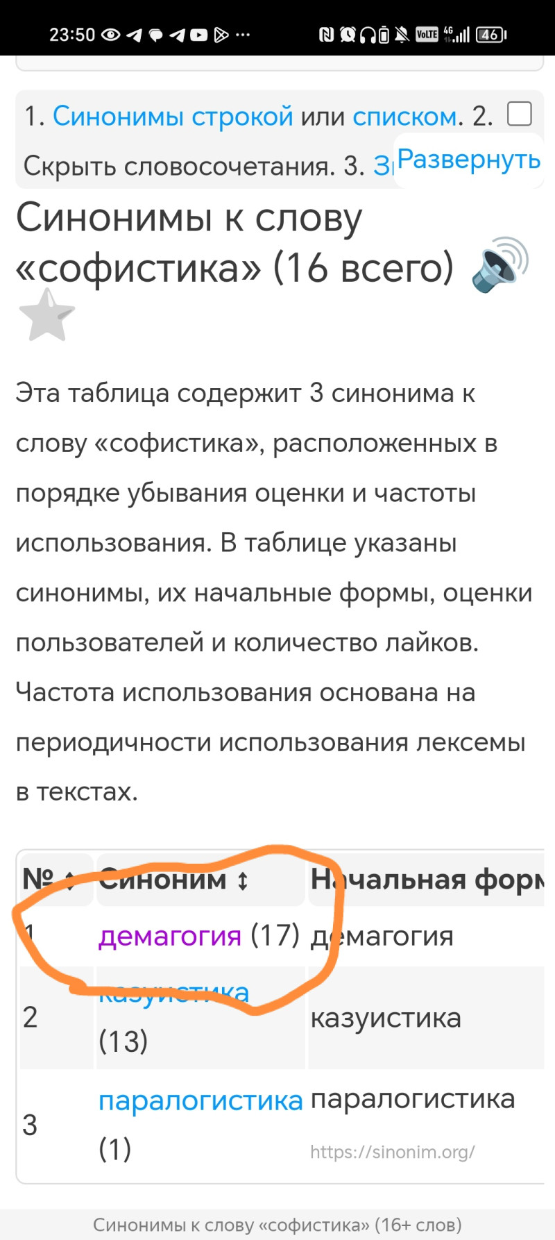 Наличие софистики (да ещё и ахинеи) в приведённой Вами таблице в качестве синонима к демагогии показывает только уровнь компетенции создателей этой таблицы.