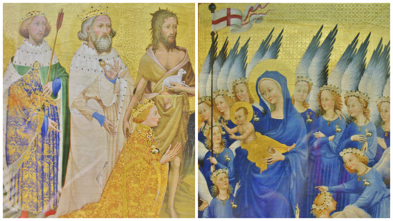 Диптих изобилует гербовым знаком короля Ричарда, и если закрыть диптих то олень будет изображен с золотой короной на шее. Король-кокетка был прекрасен ( самый симпатичный король Англии) но тратил неприлично много и безудержно, доказывая свою власть. Однажды он все таки "споткнулся" но ему удалось восстановить корону, с трудом, но удалось.